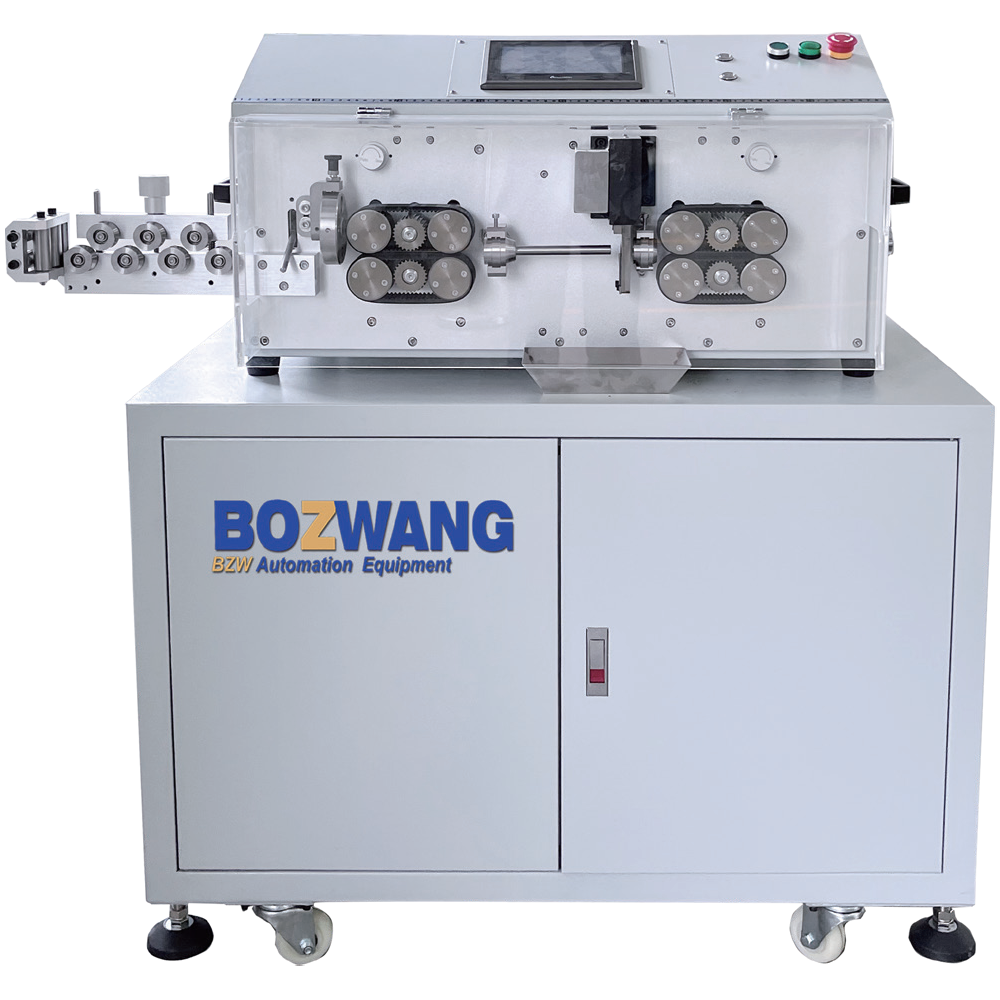 Компьютеризированная машина для резки и зачистки кабеля площадью 50 мм² — это новый кабельный процессор с микрокомпьютерным управлением, в основном для новых энергетических, фотоэлектрических, коммуникационных, электронных систем управления, высоковольтных линий электропередачи и многожильных кабелей с оболочкой. Он решает трудности обработки проводов большого сечения и многожильных кабелей с оболочкой за счет автоматической резки, снятия изоляции с двух концов и одновременной многослойной зачистки. Оснащенный промышленным чипом управления и высокоточным сервоприводом, он работает стабильно и быстро. Управление ПЛК и работа с сенсорным экраном упрощают использование. Конструкция с ременным приводом позволяет избежать вмятин кабеля. Он поддерживает индивидуальный сервопривод, конфигурируемый шкаф, имеет зарезервированные порты для подключения системы MES и дополнительное вспомогательное оборудование (автомат подачи проволоки, конвейерную ленту и т. д.).